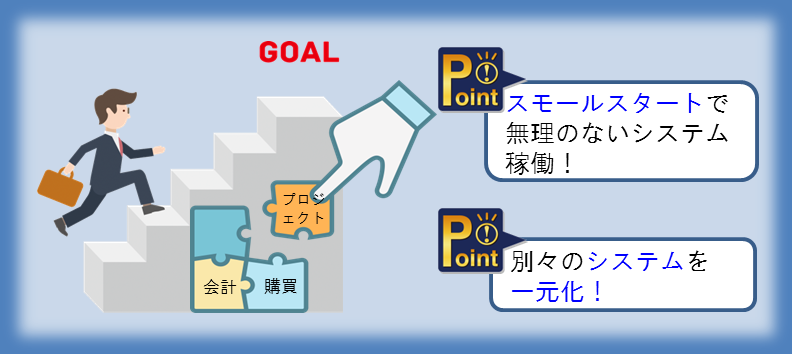 - ●担当者が業務要件の検討時間をとれず、まとめてシステムを導入するパワーが足りない。